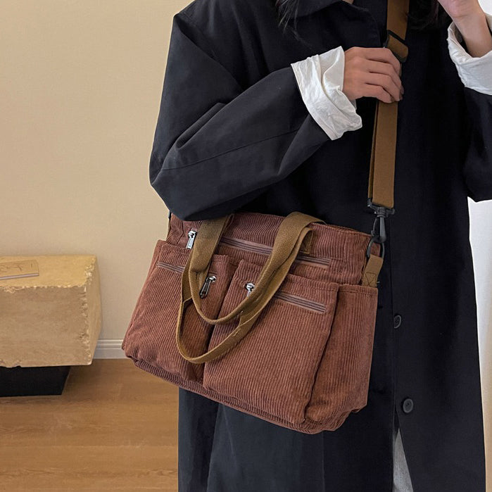 Effortlessly casual with a nostalgic touch, the Bayang Sari Corduroy Tote is your new go-to companion for daily errands, uni days, or laid-back weekends. Crafted from soft, ribbed corduroy with matching wide-weave top handles, this tote brings both texture and practicality to your look. The spacious interior fits all your daily essentials — from laptop and tumbler to umbrella and more — while its exterior zipped pockets keep smaller items within easy reach.